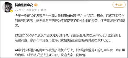 9月8日,抖音集團(tuán)副總裁李亮針對(duì)當(dāng)前社會(huì)AI亂象發(fā)文予以警告: