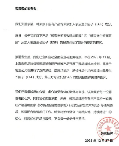 12月27日,@韓束KANS發(fā)文稱,“報道發(fā)生后,我們已立即啟動全面自查與追溯程序。早在2025年11月,上海市藥品監(jiān)督管理局稽查局已就該產(chǎn)品開展了現(xiàn)場核驗與檢測,并基于客觀公允性進行了雙向送檢,結(jié)果均顯示送檢樣品中均未添加人表皮生長因子(EGF)成分。”