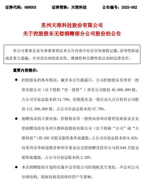 800萬股股份+800萬元現(xiàn)金!天準(zhǔn)科技控股股東青一投資向蘇州兩家基金會(huì)捐贈(zèng)