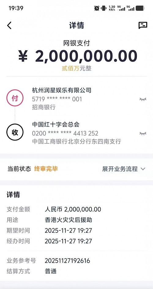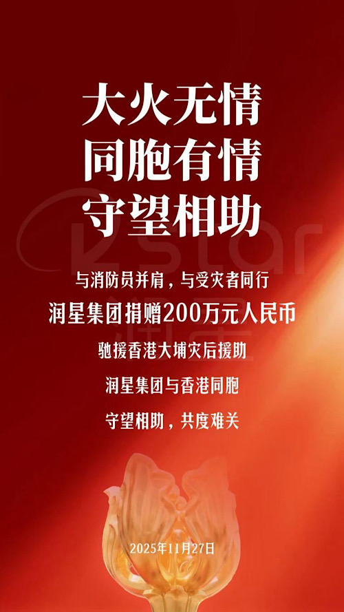 楊潤心表示:“大火無情,同胞有情,我們要與香港同胞們守望相助,協(xié)同救災(zāi)。”潤星集團(tuán)深知作為社會(huì)一員所肩負(fù)的責(zé)任,希望借此捐款為前線救援工作提供支持,向受影響的家庭及民眾傳遞關(guān)懷與力量。后續(xù),潤星將持續(xù)關(guān)注災(zāi)后恢復(fù)工作,并提供力所能及的協(xié)助。
