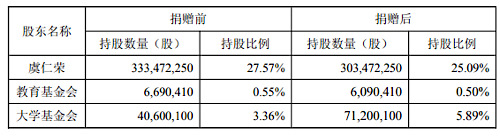 截至公告披露日,虞仁榮持有公司股份333472250股,占公司目前總股本的27.57%;公司股東教育基金會持有公司股份6690410股,占公司目前總股本的0.55%。此次捐贈后,虞仁榮持股比例降至25.09%,教育基金會持股比例降至0.50%,大學(xué)基金會持股比例升至5.89%。