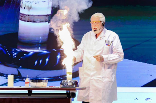 在隨后的“化學(xué)魔法”課堂上,中國(guó)工合國(guó)際委員會(huì)副主席、北京化工大學(xué)科普實(shí)驗(yàn)中心主任、中國(guó)政府“友誼獎(jiǎng)”獲得者、英國(guó)籍化學(xué)專家戴偉教授針對(duì)高中生和小學(xué)、初中年齡段學(xué)生的不同特點(diǎn),分別以“什么是化學(xué)反應(yīng)”、“化學(xué)無處不在”為題,為同學(xué)們帶來了生動(dòng)、奇妙的化學(xué)課程。講座開場(chǎng),戴偉教授便以“點(diǎn)水成火”的神奇實(shí)驗(yàn)吸引了全場(chǎng)目光。