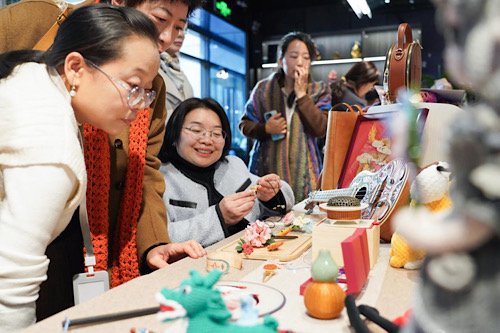 觀眾在互動體驗區(qū)沉浸式體驗了絨線編織、紫砂壺制作等工藝過程,在一針一線、一捏一塑間感受到傳統(tǒng)技藝的文化底蘊。