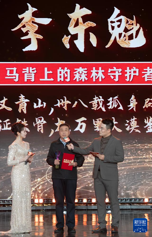 1月28日,由新華社主辦的“中國網(wǎng)事·感動2025”公益盛典暨年度頒獎典禮在北京舉行,活動揭曉“中國網(wǎng)事·感動2025”十大年度網(wǎng)絡人物。這是“馬背上的森林守護者”李東魁(中)出席頒獎典禮。新華社記者 李安 攝