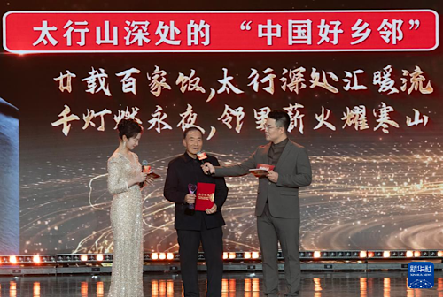 1月28日,由新華社主辦的“中國網(wǎng)事·感動2025”公益盛典暨年度頒獎典禮在北京舉行,活動揭曉“中國網(wǎng)事·感動2025”十大年度網(wǎng)絡人物。這是“太行山深處的‘中國好鄉(xiāng)鄰’”黃崖溝村村民代表(中)出席頒獎典禮。新華社記者 李安 攝