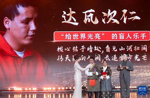 1月28日,由新華社主辦的“中國網(wǎng)事·感動2025”公益盛典暨年度頒獎典禮在北京舉行,活動揭曉“中國網(wǎng)事·感動2025”十大年度網(wǎng)絡人物。這是“‘給世界光亮’的盲人樂手”達瓦次仁(左二)出席頒獎典禮。新華社記者 李安 攝