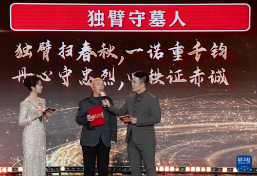 1月28日,由新華社主辦的“中國網(wǎng)事·感動2025”公益盛典暨年度頒獎典禮在北京舉行,活動揭曉“中國網(wǎng)事·感動2025”十大年度網(wǎng)絡人物。這是“獨臂守墓人”蔡恩坤(中)出席頒獎典禮。新華社記者 李安 攝