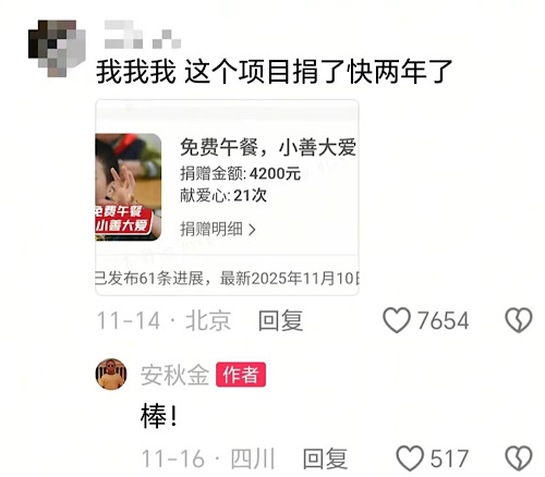 在安秋金的評(píng)論區(qū)里,一位粉絲曬出一張分享圖:“你是第6341位愛心伙伴,感謝你與安秋金攜手,為‘圓山區(qū)孩子成長(zhǎng)夢(mèng)’累計(jì)捐贈(zèng)1785元。”他評(píng)論道,月捐到現(xiàn)在,看到能讓小妹妹覺得在這里過(guò)生日很開心,這里面有我一份力。