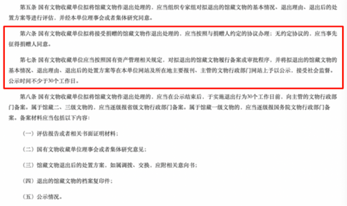 記者查詢到,2018年6月29日國家文物局公布的《國有館藏文物退出管理暫行辦法》第六條明確,國有文物收藏單位擬將接受捐贈(zèng)的館藏文物作退出處理的,應(yīng)當(dāng)按照與捐贈(zèng)人約定的協(xié)議辦理;無約定協(xié)議的,應(yīng)當(dāng)事先征得捐贈(zèng)人同意。